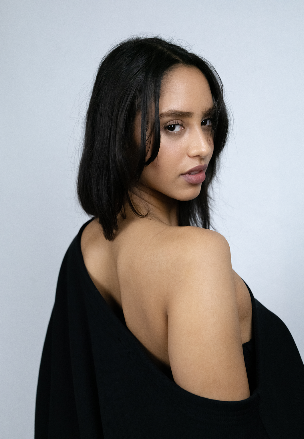 Seamless black coloured off the shoulder sweater